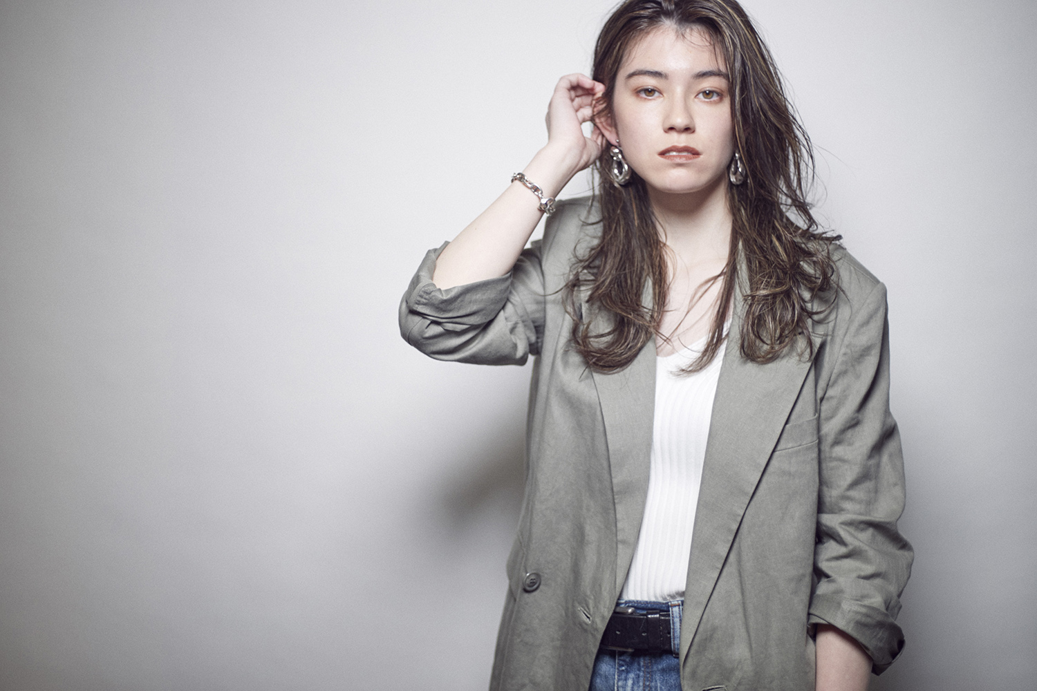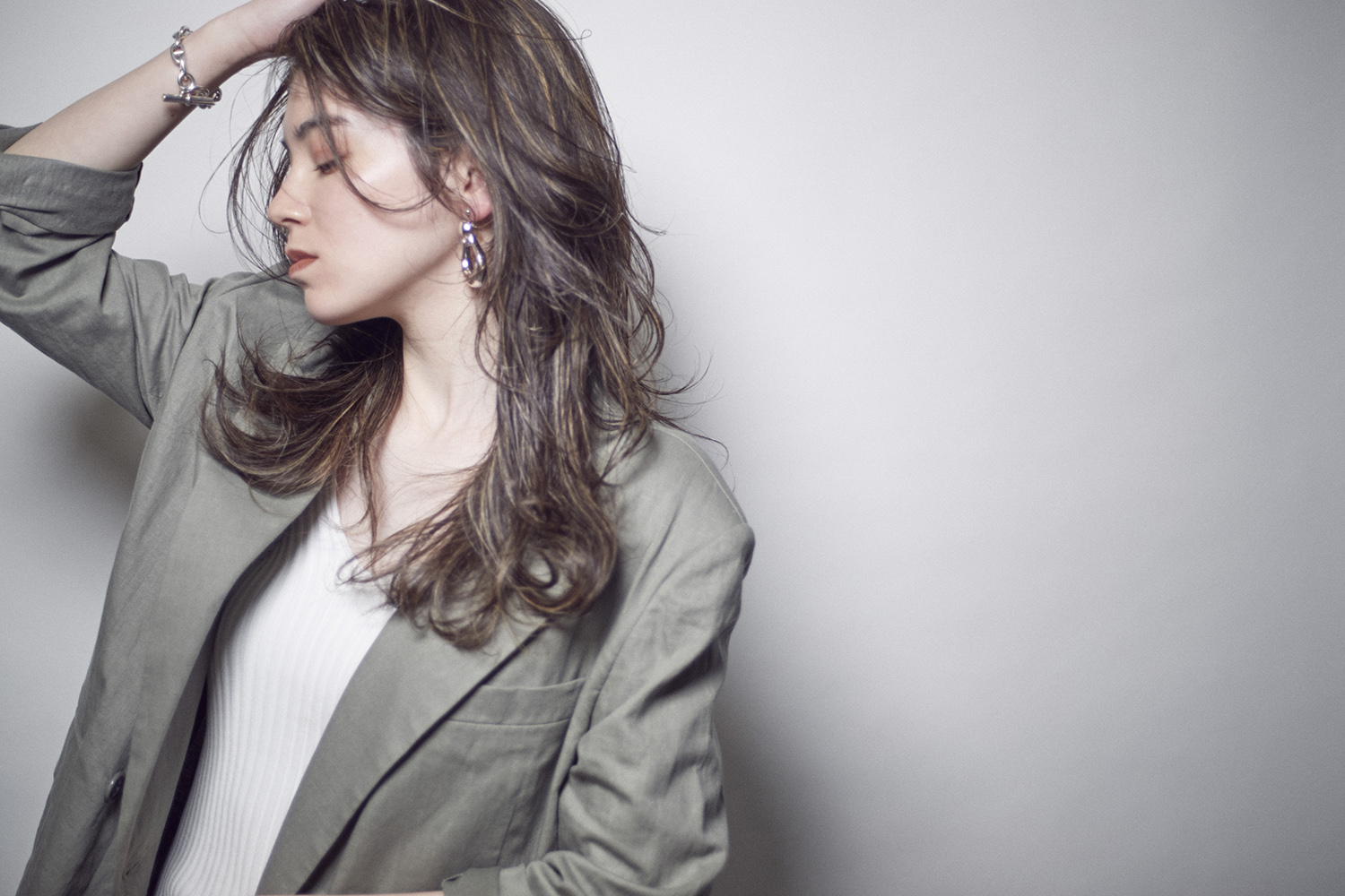 胸上で揃えたローレイヤー。顔まわりに流れるような動きを出すために、あご下から前髪をカット。全体は10トーンのグレージュ。ハイライトを入れ、アッシュのトナーをかぶせています。
