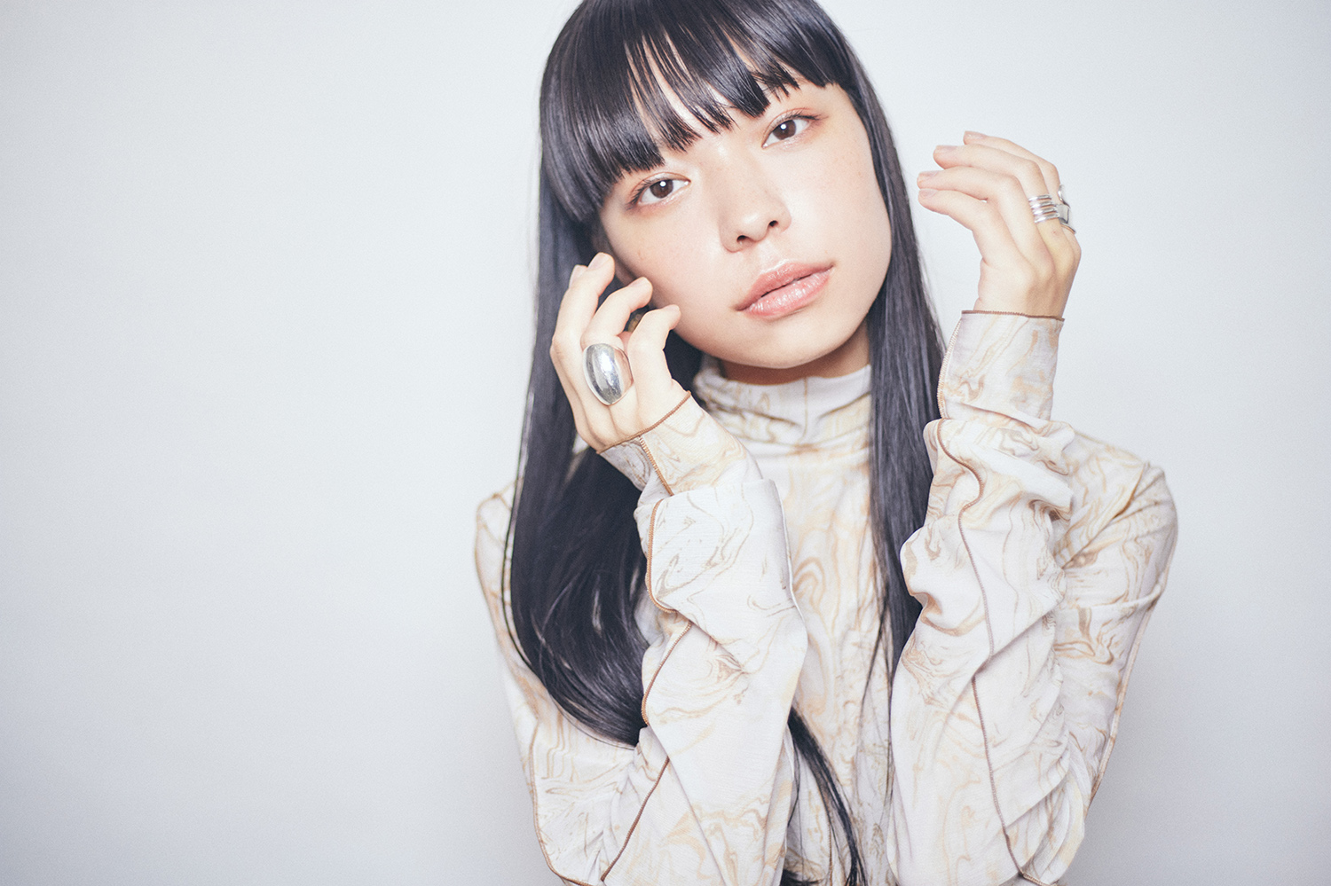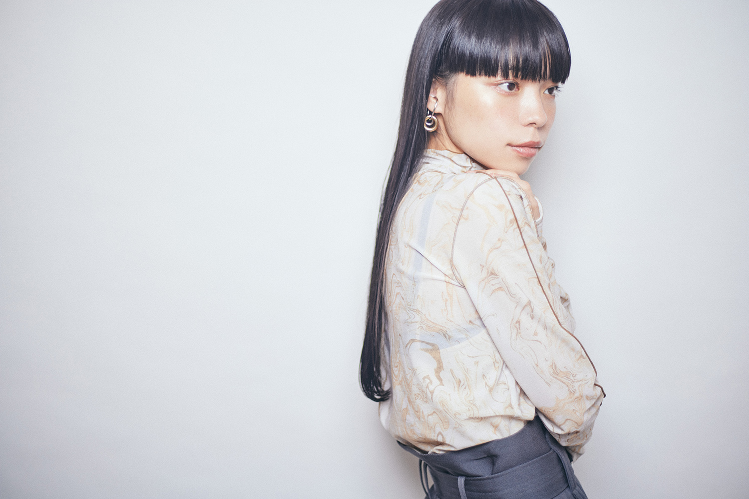ワイドバングが印象的なスタイル。