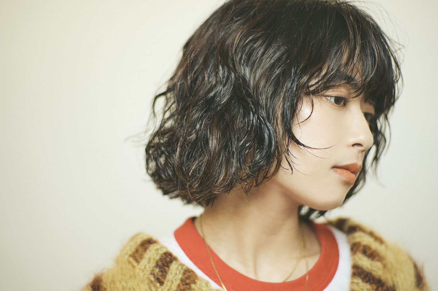 前髪を厚く顔周りにレイヤーを入れて動きを出したウェービーなボブスタイル。タオルドライ後にバームを揉み込み弱風で乾かすとウェットな質感で完成します。
